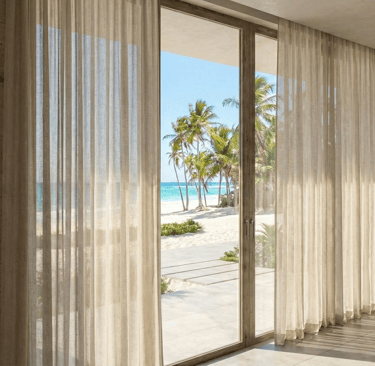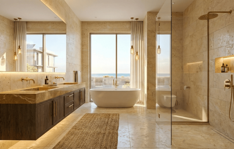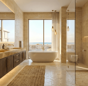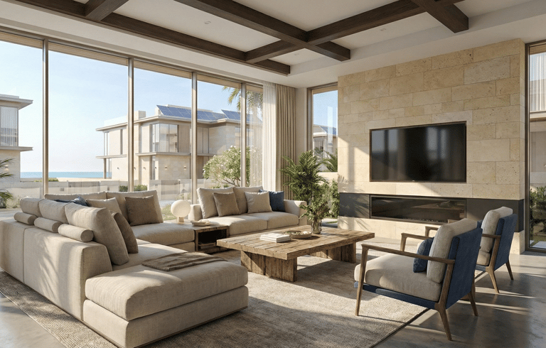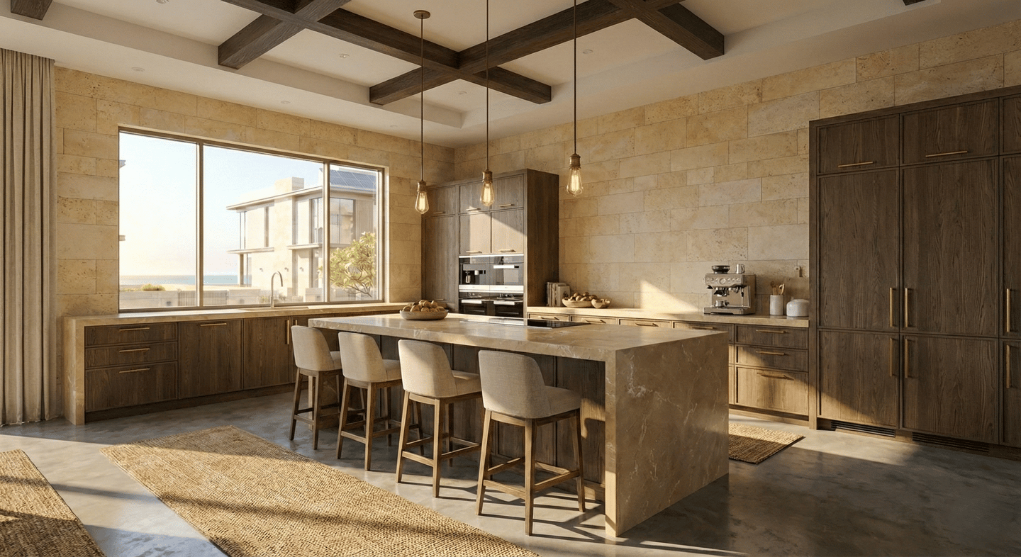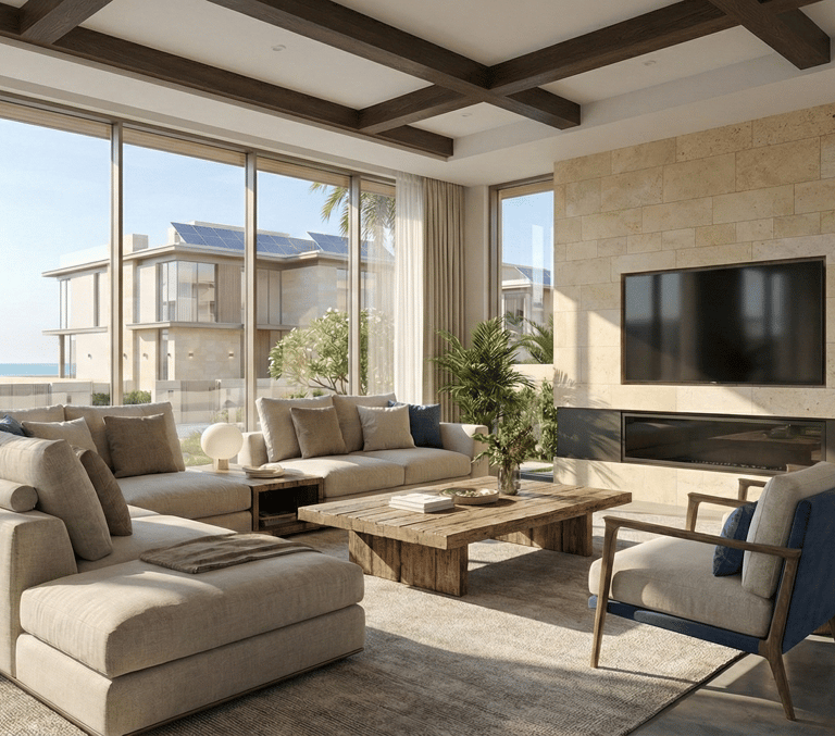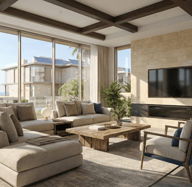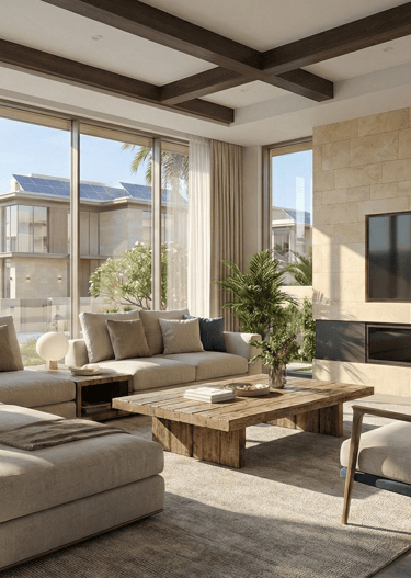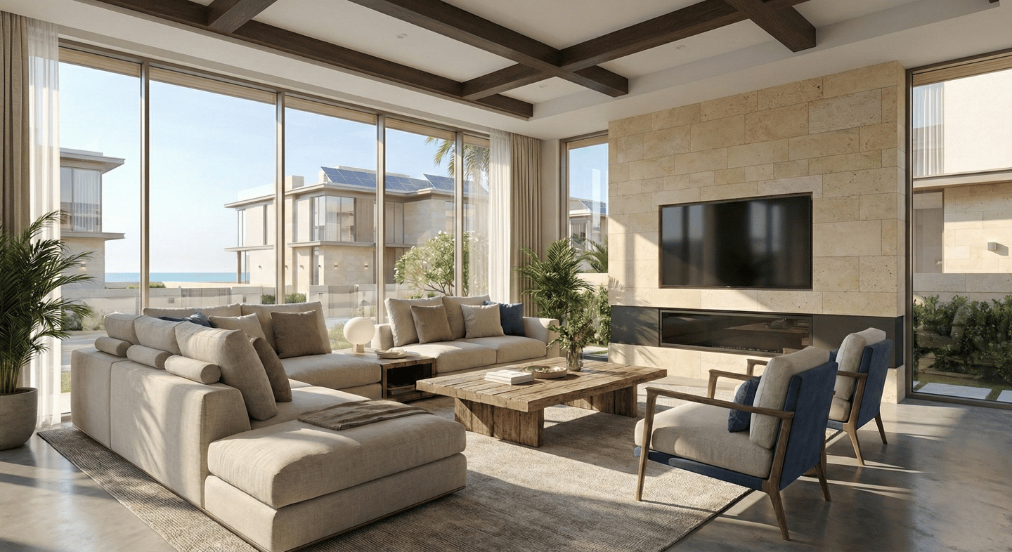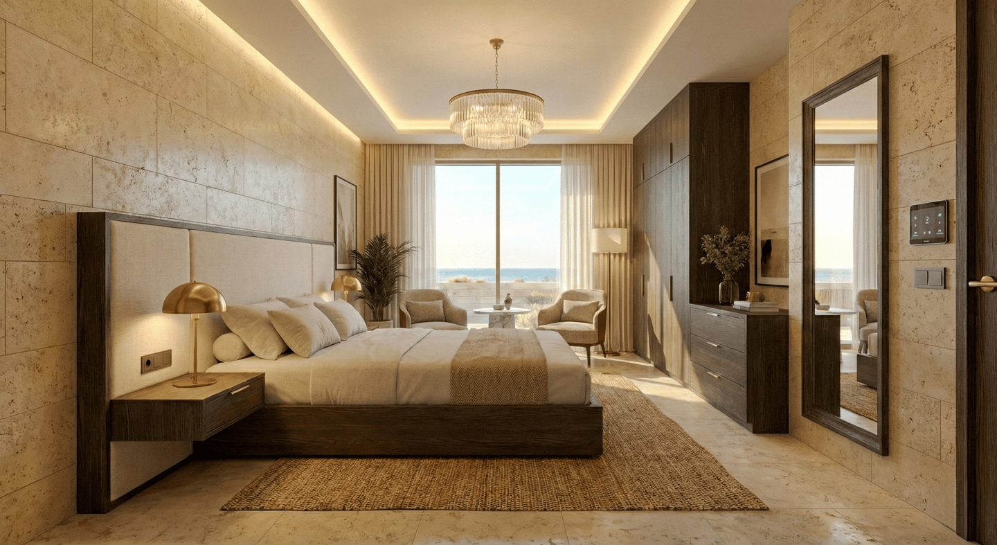Open. Airy. Connected. The main lounge dissolves the boundary between indoors and outdoors. Floor-to-ceiling thermal glass maximizes the view while keeping the interior cool. The joinery features hidden ambient lighting, casting a soft glow over the Italian porcelain flooring.