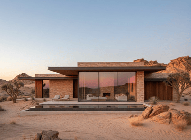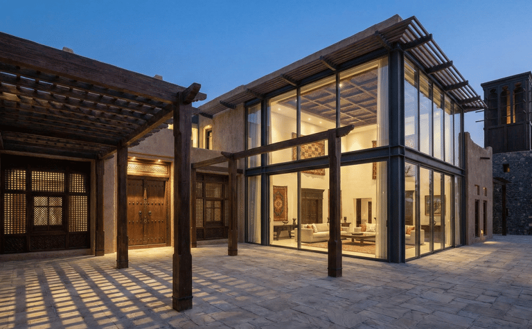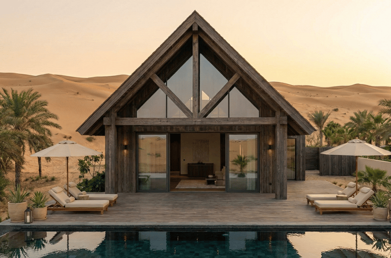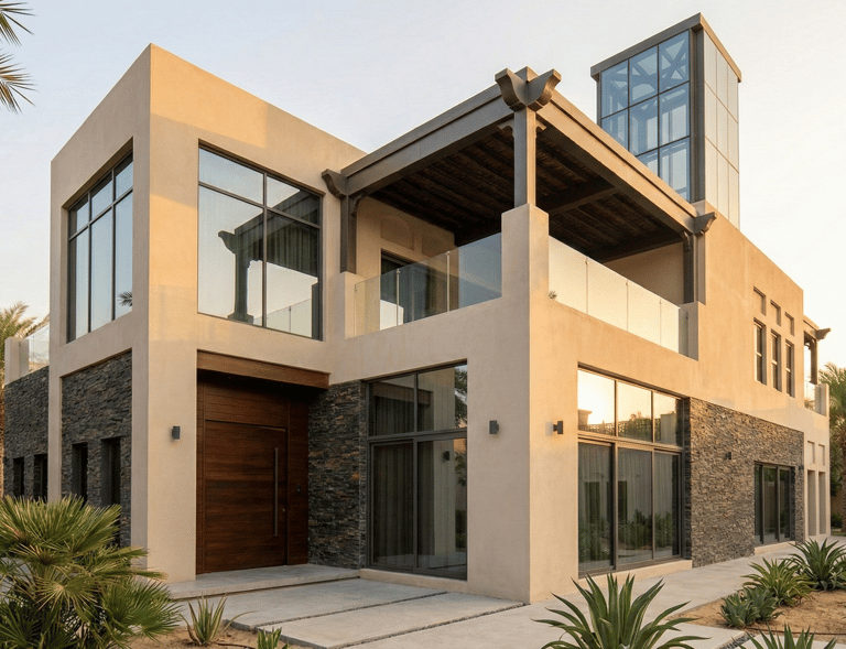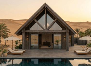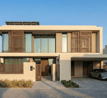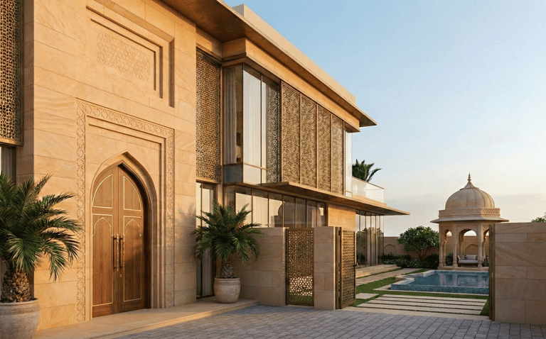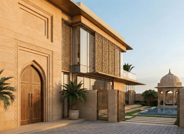 A contemporary reinterpretation of Indian architecture, tailored for the Dubai climate. This residence features a thermal-efficient sandstone facade, custom geometric shading systems, and a central double-height atrium that promotes passive cooling. Blending handcrafted teak joinery with floor-to-ceiling glass, the design creates a seamless transition between the grand interior and the private outdoor oasis.