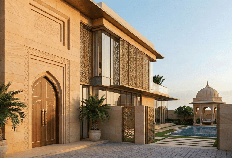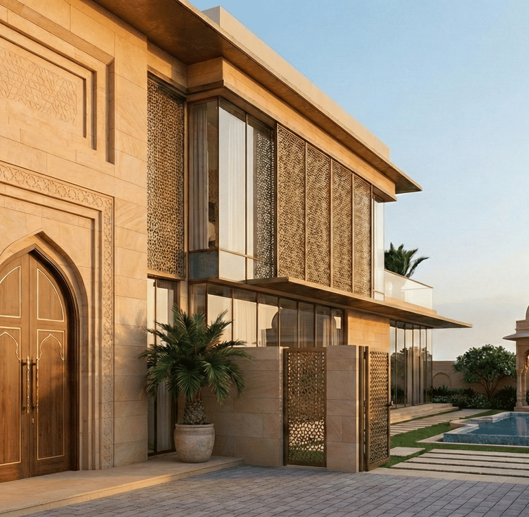 The structure rejects the harsh glare of the desert sun in favor of cool, shaded intimacy. The facade is clad in authentic Dholpur Sandstone, hand-sourced from Rajasthan, lending the home a golden, timeless warmth. The defining architectural feature is the intricate Jaali screening, modern geometric lattices that cloak the upper floors. These screens act as a traditional brise soleil, fracturing the intense sunlight into a dancing pattern of shadows while maintaining absolute privacy.