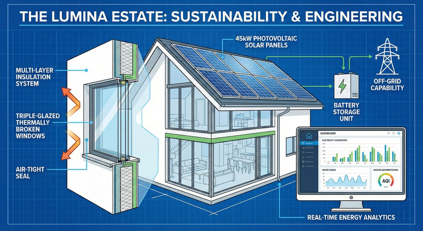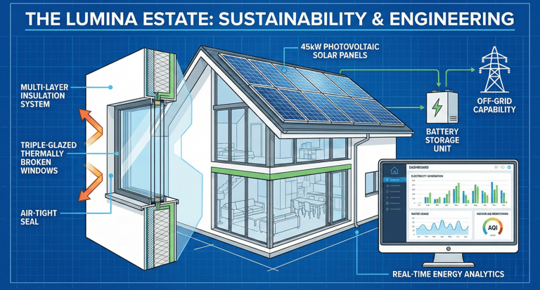 Integrated Solar Array: A 45kW photovoltaic system with battery storage allows the estate to run "off-grid" during peak hours.