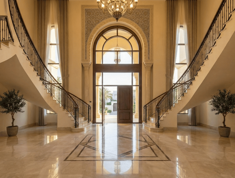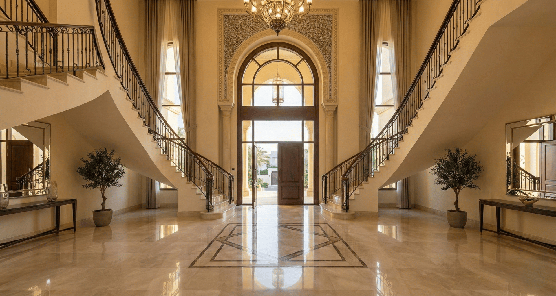 The design for the entrance sets a tone of incredible scale. The concept features a double-height foyer, featuring a sweeping dual staircase and a custom crystal chandelier, framing a direct sightline through to the expansive rear gardens.